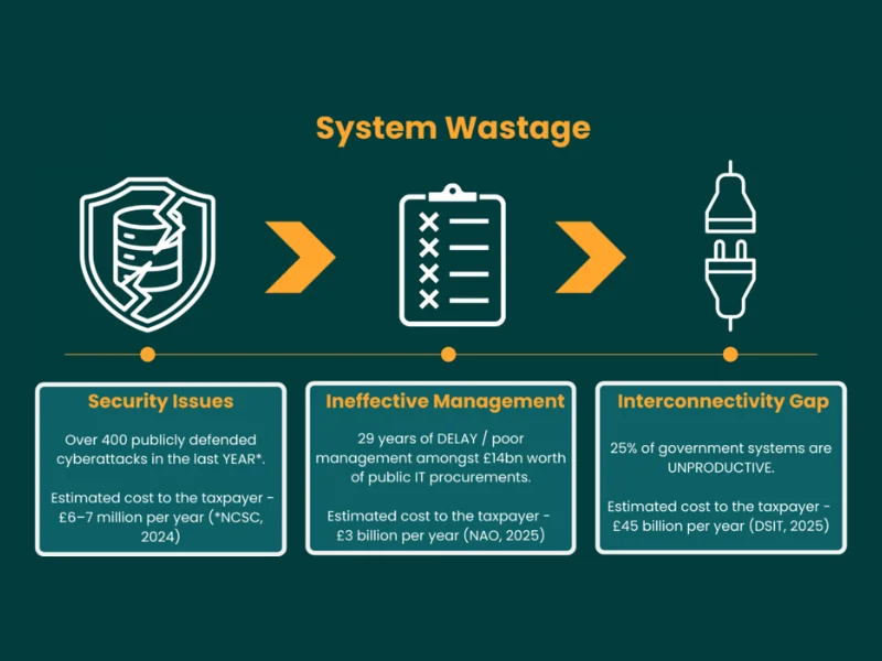 Some 25% of government systems are outdated, according to findings from DSIT (2025) – contributing to an estimated cost of £45 billion a year to the taxpayer.