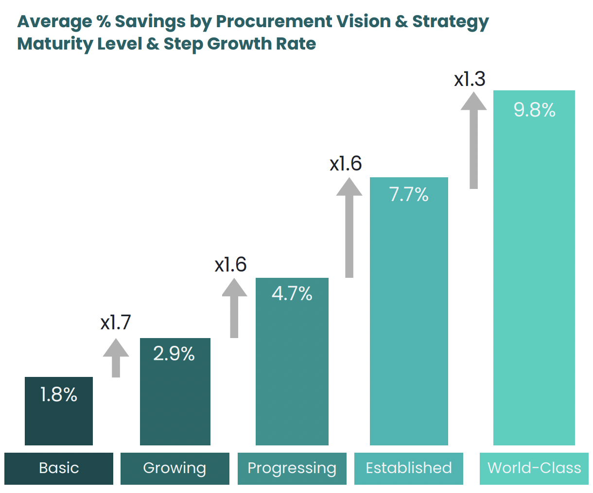 When it comes to savings and bottom-line performance, the differences between maturity levels are clear. Organisations with a ‘World-Class’ procurement vision and strategy have been delivering 5.6x more savings (8.1%) compared to those operating at a ‘Basic’ level.